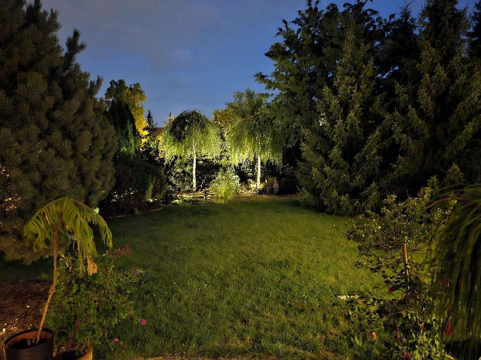 Oświetlenie domu i ogrodu z czujnikami zmierzchu. System kamer monitorujących cały teren z dostępem przez aplikację mobilną.