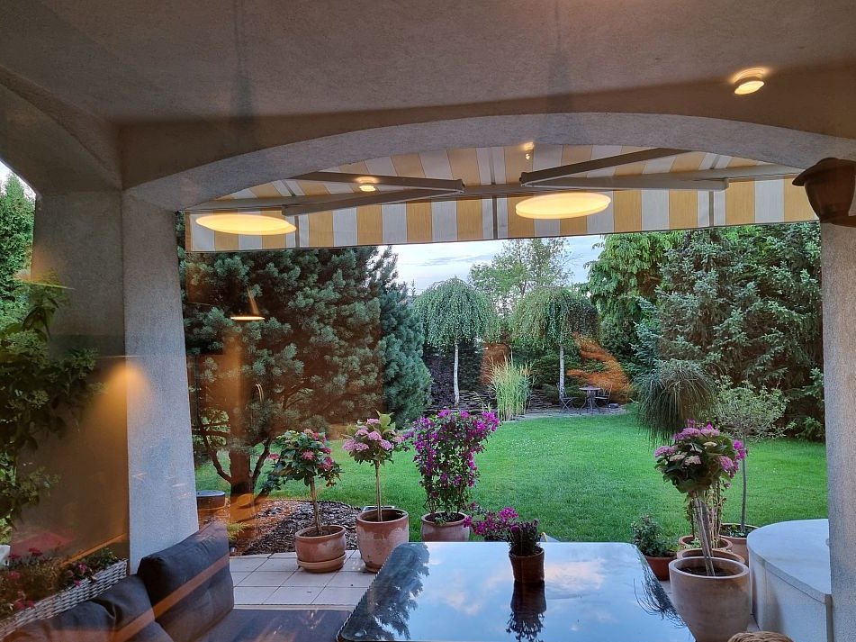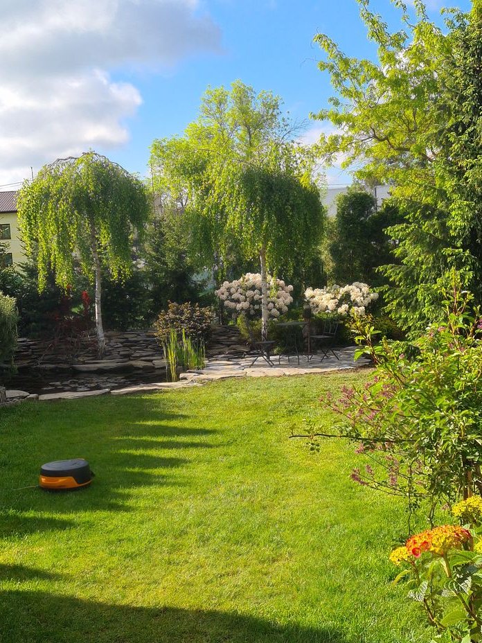Dojrzały, starannie zaprojektowany ogród z wieloletnią roślinnością, oczkiem wodnym z systemem pomp i filtrów oraz automatycznym systemem nawadniania podłączonym do osobnego wodomierza.