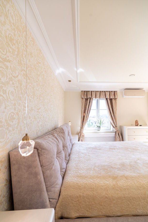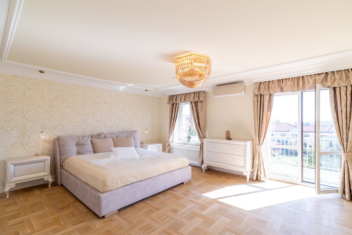 Sypialnia duża, przestrzenna, jasna. Na ścianach tapety Versace, designerski żyrandol meble prestiżowej marki Novelle .
