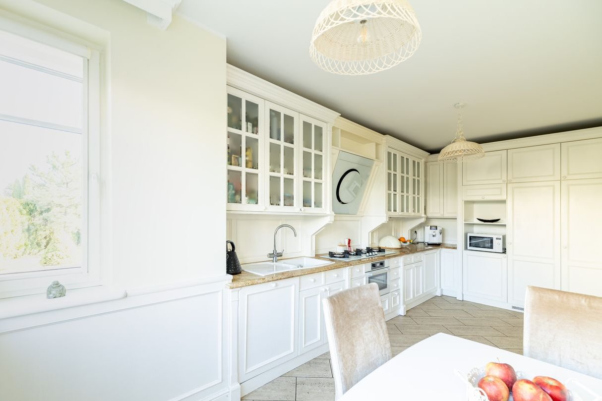 Kuchnia w stylu angielskim, jasna i praktyczna. Meble wykonane z drewna na indywidualne zamówienie.