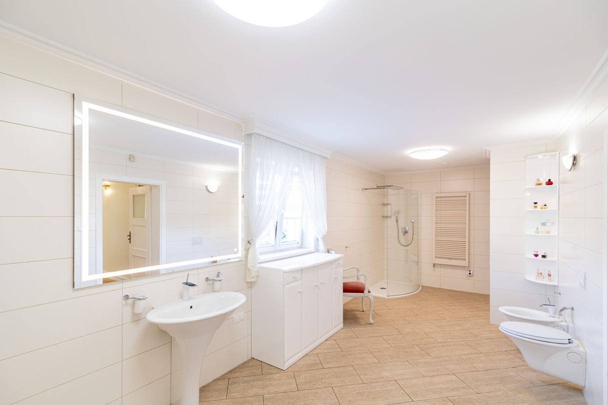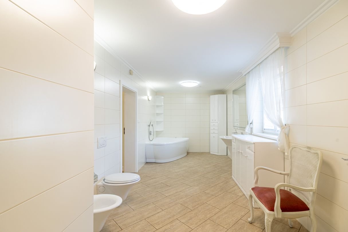 Do dyspozycji 2 łazienki. Na piętrze z znajduje się pokój kąpielowy z komfortową wanną z chromoterapią (terapia kolorem przynosi ukojenie po stresującym dniu) oraz prysznicem. Na dole znajduje się mniejsza łazienka do bieżącego korzystania w części dziennej domu.