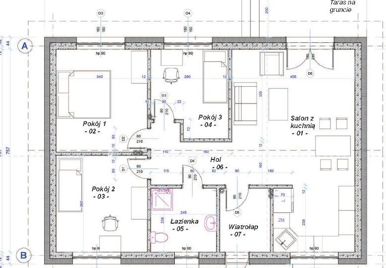 Przez zadaszone wejście wchodzimy do wiatrołapu z miejscem na szafę. Stąd jest możliwość przejścia do części dziennej, którą tworzy jasny, przestronny salon połączony z jadalnią i kuchnią. Z salonu jest możliwość bezpośredniego wyjścia na taras. Centralnie zlokalizowany hol jest łącznikiem pomiędzy poszczególnymi pomieszczeniami budynku. W jednej części domu zlokalizowano strefę nocną, znajdują się tu trzy wygodne sypialnie i duża łazienka z miejscem na wannę, a w drugiej strefę dzienną.