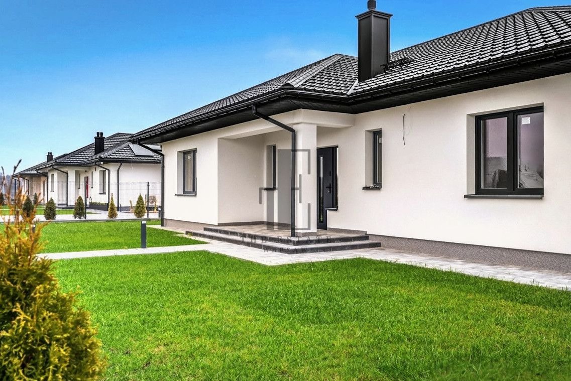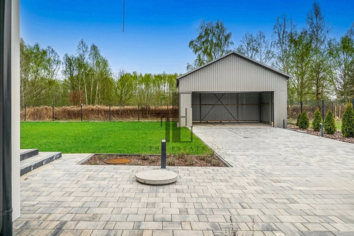 Dom będzie wyposażony w instalację pod rekuperację, pompę ciepła, kamery i alarm. W sprzedawanym standardzie będzie zamontowany automat do bramy i garażu, ogrzewanie podłogowe, wylewkę antyhrytową, oświetlenie działki i posadzone tuje. Nieruchomość będzie ogrodzona, z kostką brukową na podjeździe i automatycznym systemem nawadniania ogrodu. Trawnik będzie zasiany, a w tylnej części posesji znajdzie się wolnostojący garaż.