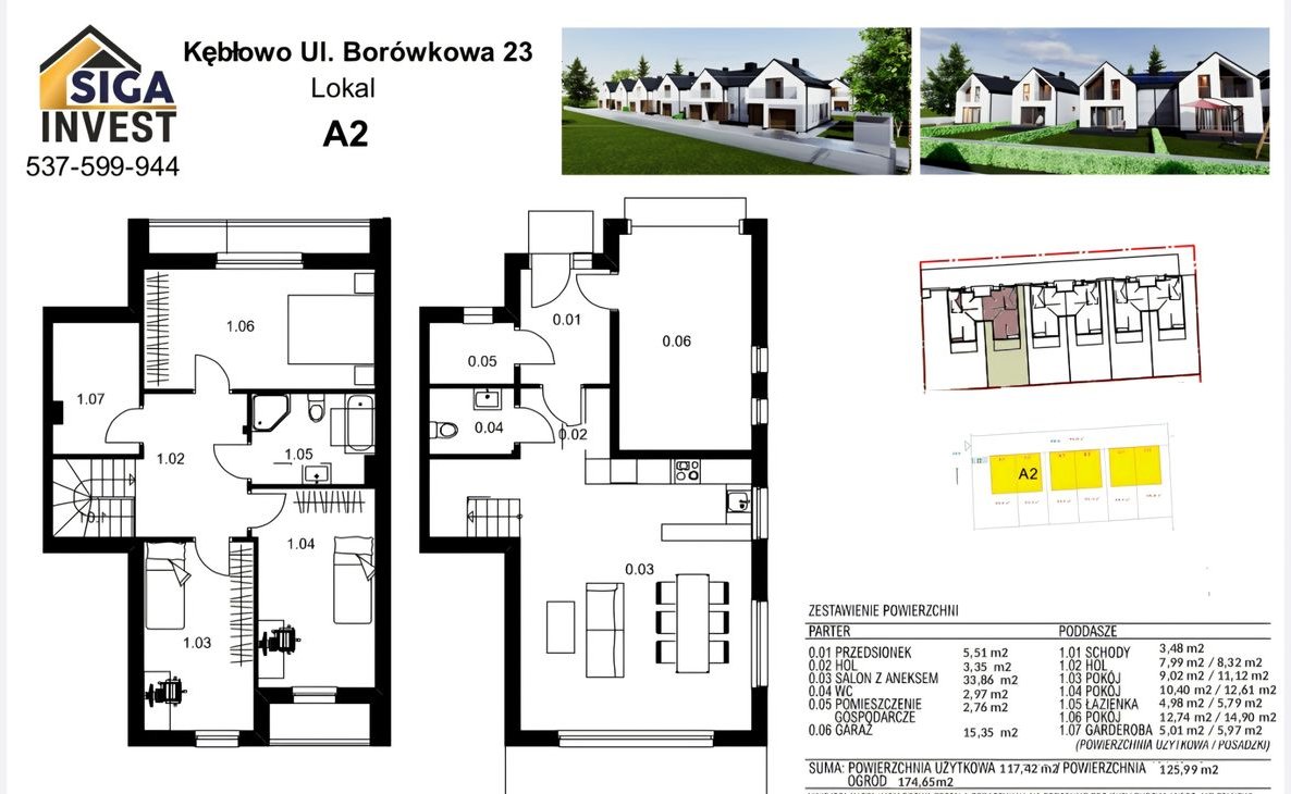 Łączna powierzchnia budynku wynosi 130,5m2 w tym garaż w bryle budynku z bramą sygmentową. Do lokalu przynależy działka o powierzchni 223m2.