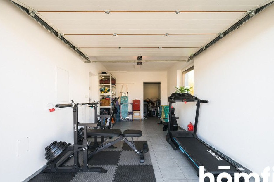 On the ground floor, you'll find a living room with large patio doors, a kitchenette with a long worktop connected to the living room and dining area, a bathroom with shower, washing machine, and dryer, a hall with a wardrobe and seating area, and access to the garage and boiler room. A wooden oak staircase leads to the first floor, where you'll find four well-arranged, bright rooms—ideal for bedrooms, children';s rooms, or a dream office for remote work—and a spacious bathroom with a window and a freestanding bathtub. The house also has an attic that can be used as additional storage space.