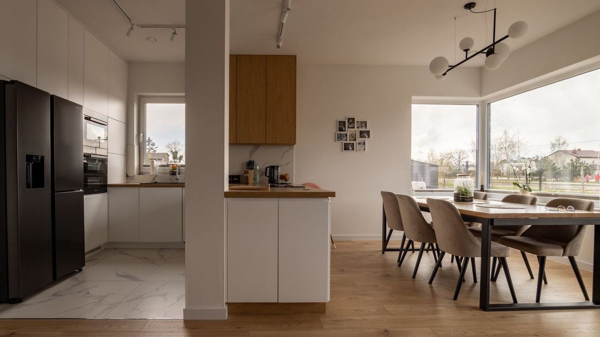 Wnętrze budynku na jego parterze daje poczucie przestrzeni i łączy otwartą, jasną kuchnię z jadalnią i strefą relaksu z kominkiem. Na parterze znajduje się również łazienka. Garaż, spokojnie pomieści nawet auta typu SUV i jest wyposażony w instalację umożliwiającą szybkie ładowanie aut elektrycznych.