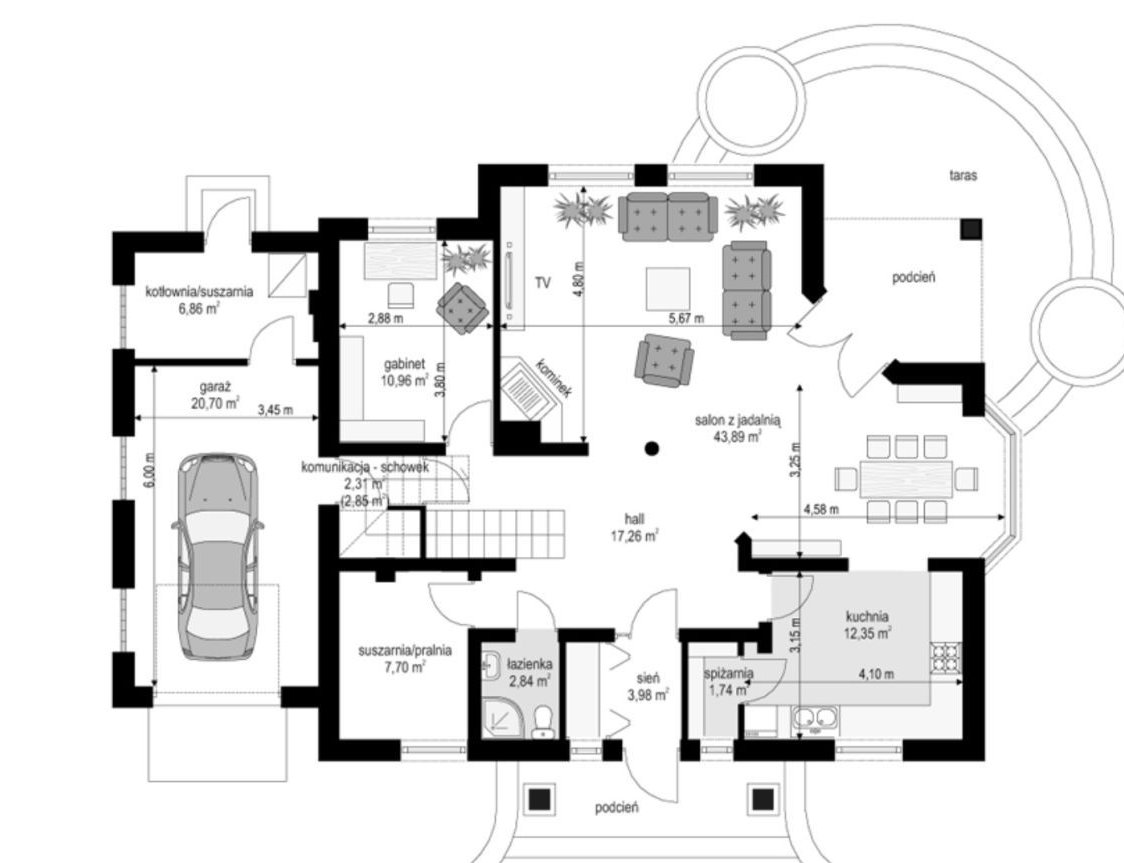 - Salon z jadalnią i aneksem kuchennym (kuchnia ze spiżarnią)