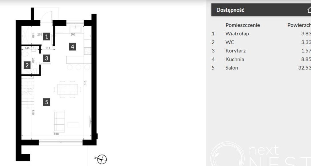 - Parter: przestronny salon z aneksem kuchennym, łazienka, wiatrołap