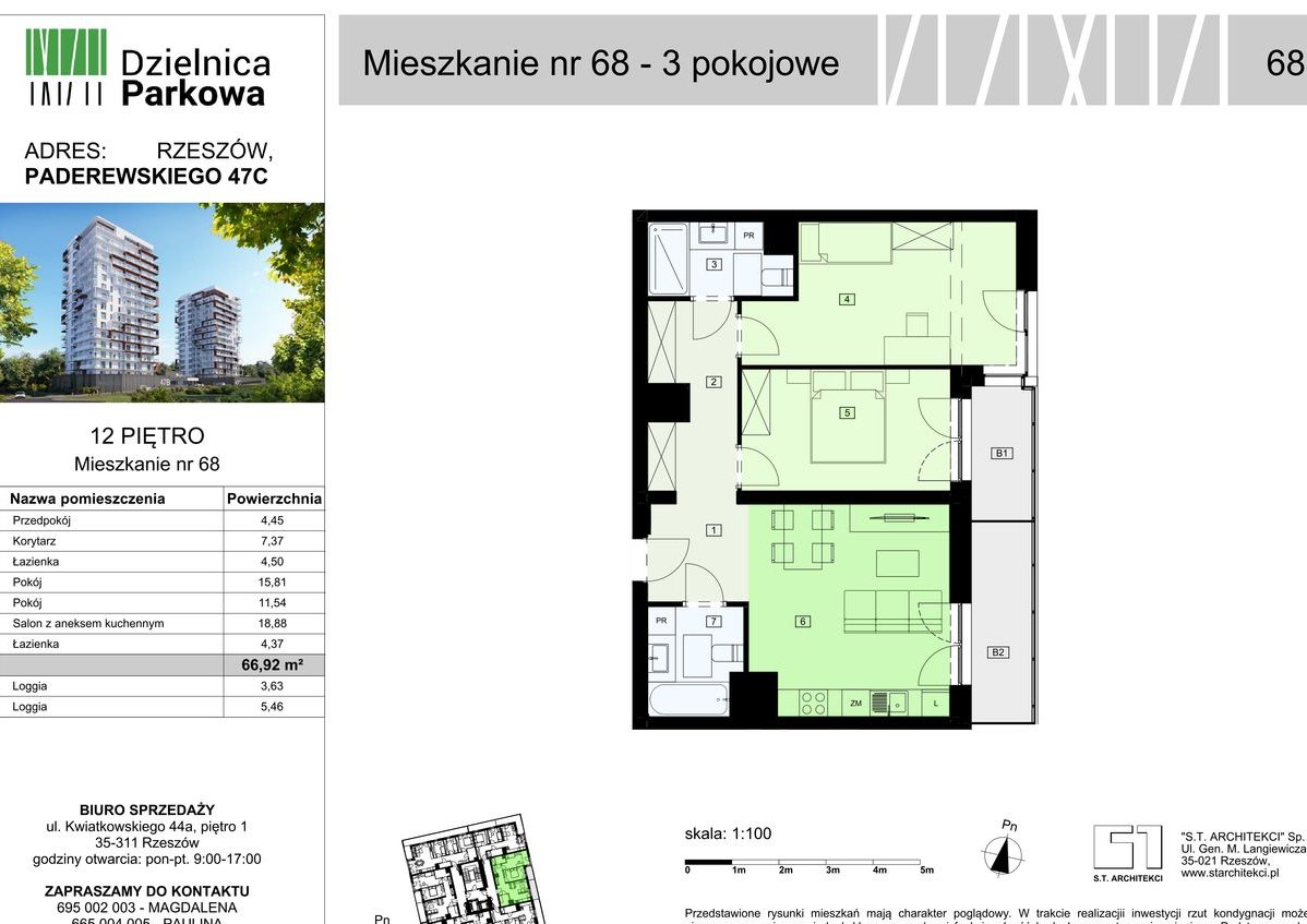 Mieszkanie o powierzchni 66,92 m2 znajduje się na XII piętrze w budynku B8 i składa się z: