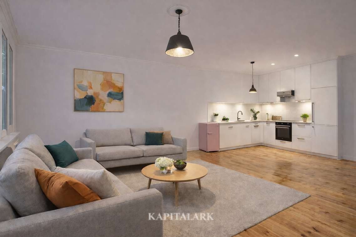 Ustawny salon z aneksem kuchennym i wyjściem na balkon