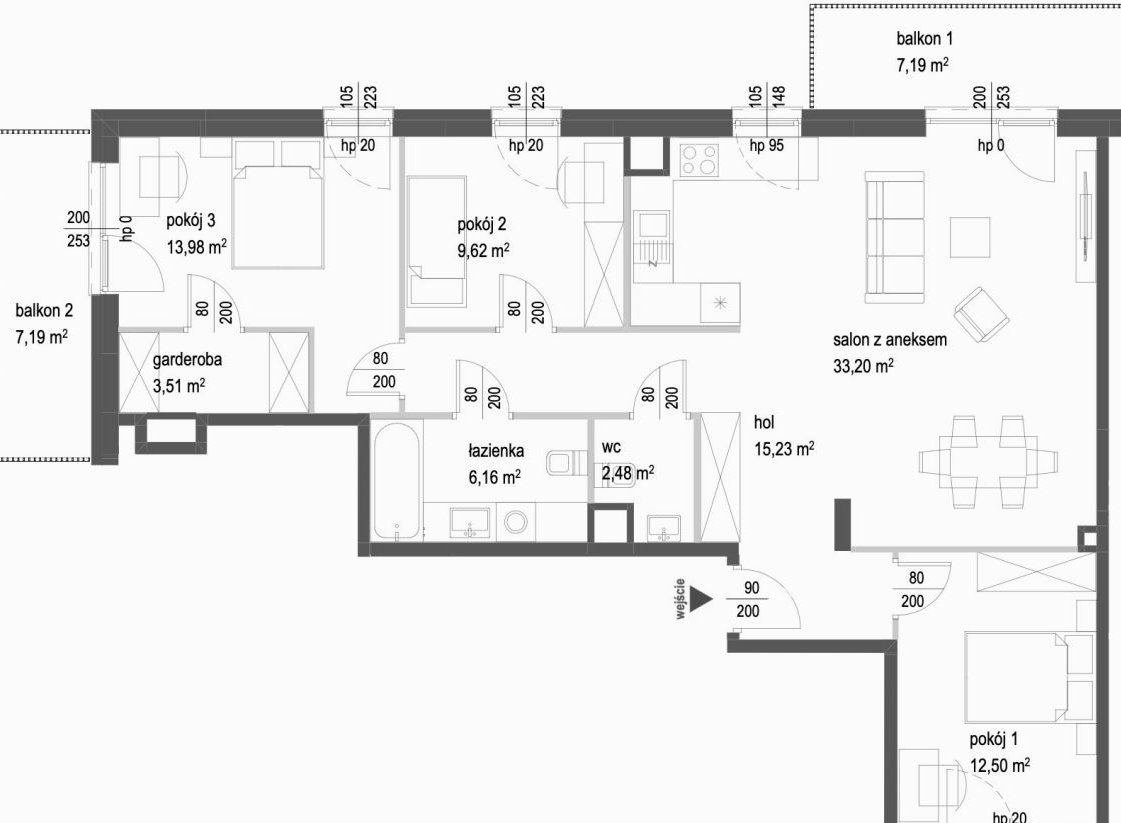 Mieszkanie posiada przestronny salon z widnym aneksem kuchennym (33,20 m2), trzy ustawne sypialnie ( 12,50 m2 ; 9,62 m2 ; 13,98), łazienkę (6,16 m2) garderobę (3,51 m2) WC( 2,48 m2) i hol wejściowy z miejscem na szafy wnękowe (15,23 m2). Dodatkowo do mieszkania przynależą piękne prywatne dwa balkony każdy o powierzchni 7,19 m2.