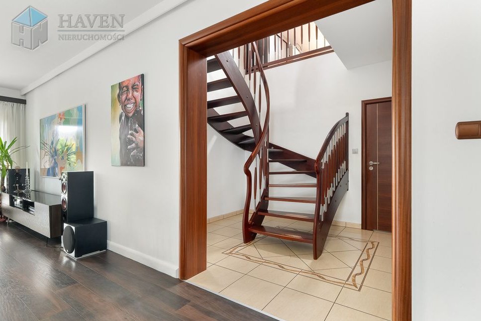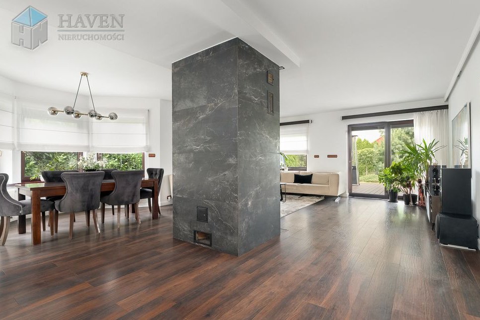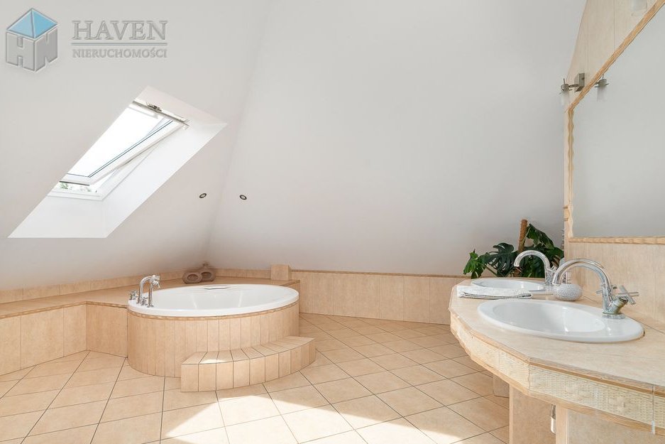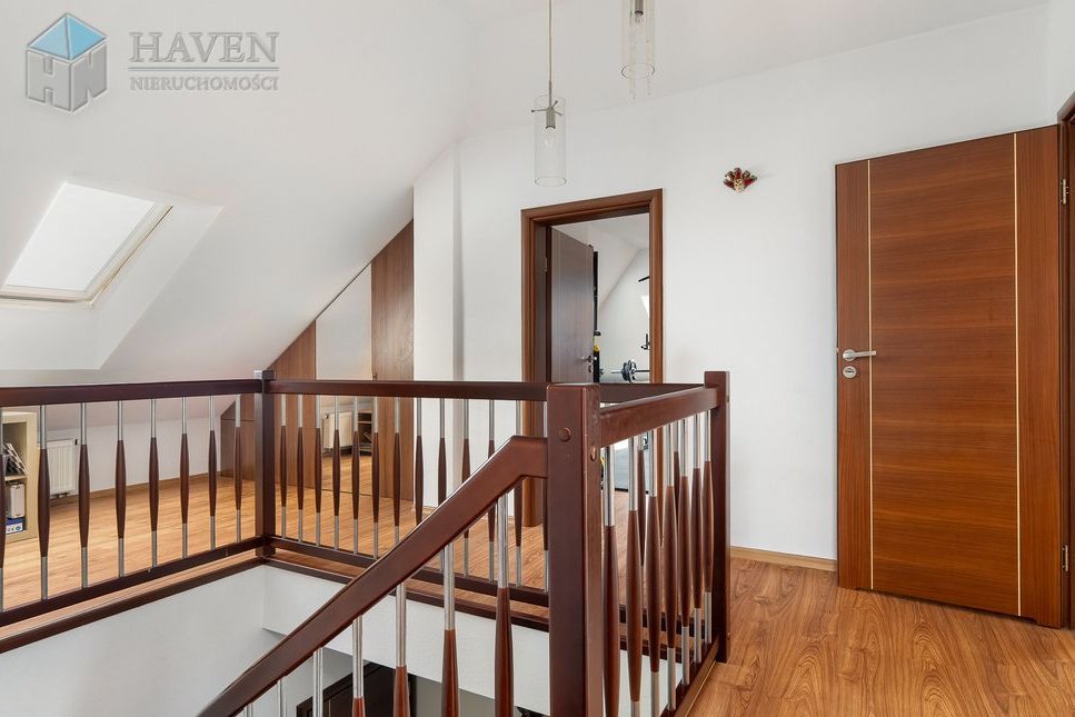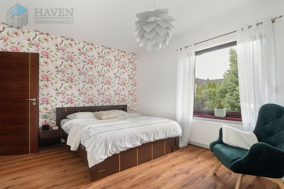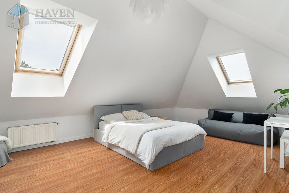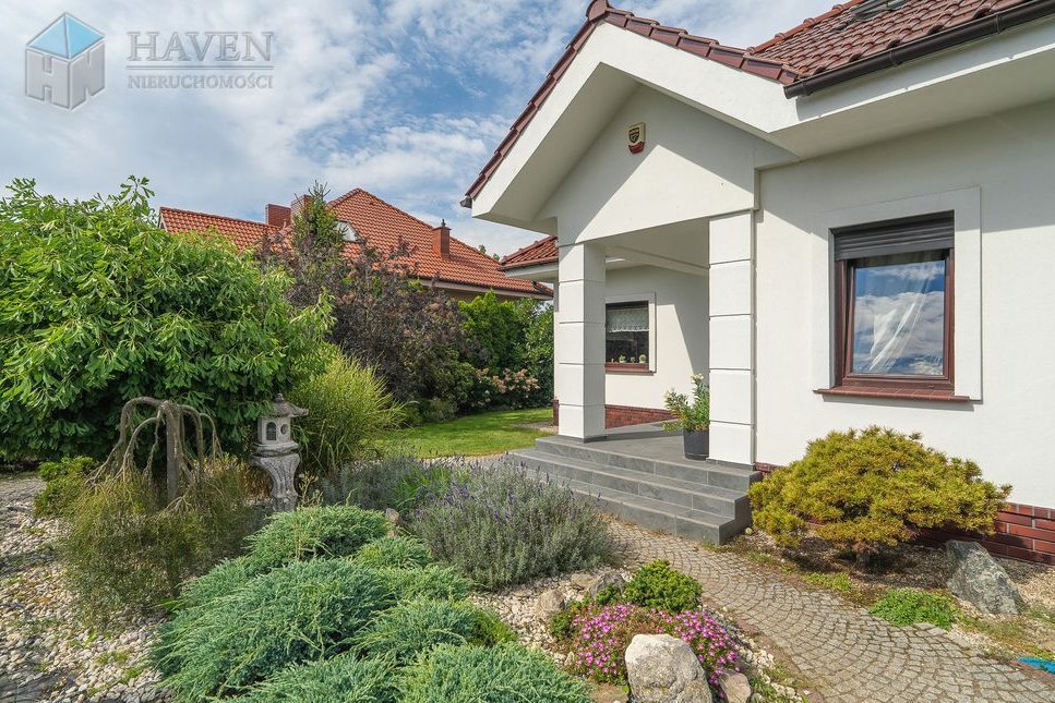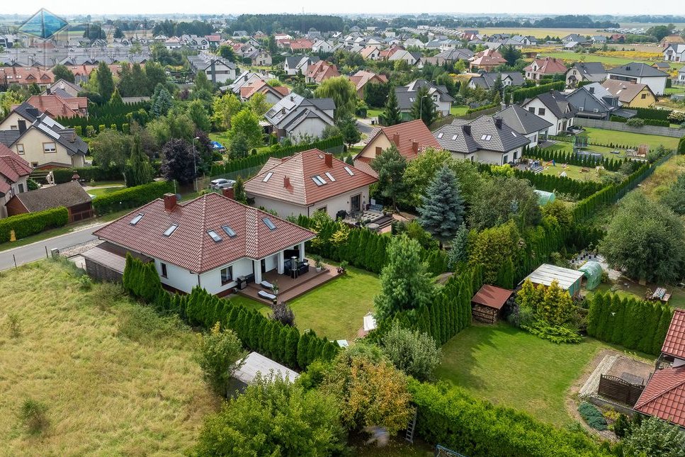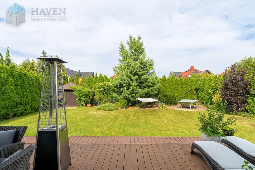 Dom parterowy z użytkowym poddaszem położony na działce o powierzchni 801 m² z północno-zachodnim ogrodem, w którym znajduje się 70 metrowy taras z kompozytu i automatyczne nawadnianie.