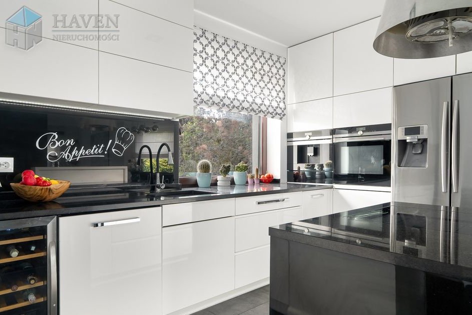 Kuchnia po modernizacji w 2015 roku: płyta indukcyjna, piekarnik z mikrofalą, lodówka side by side Samsung, ekspres w zabudowie.