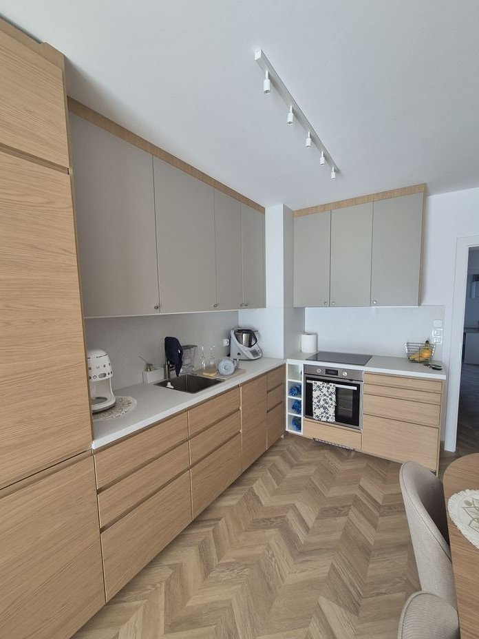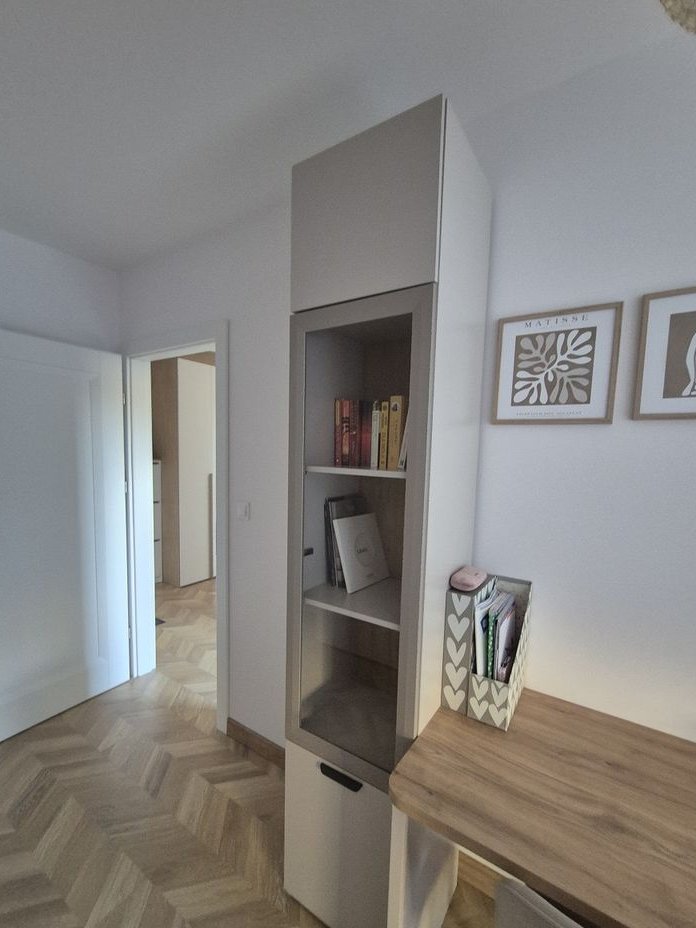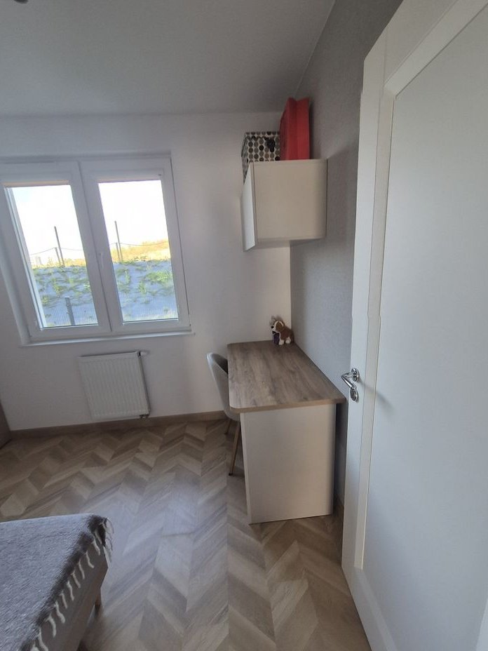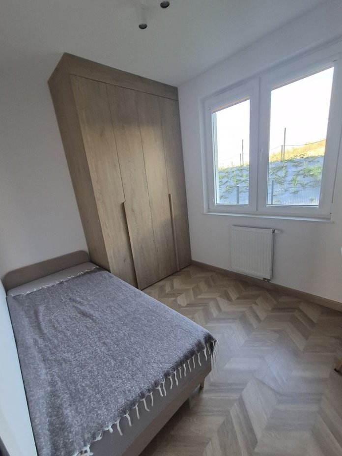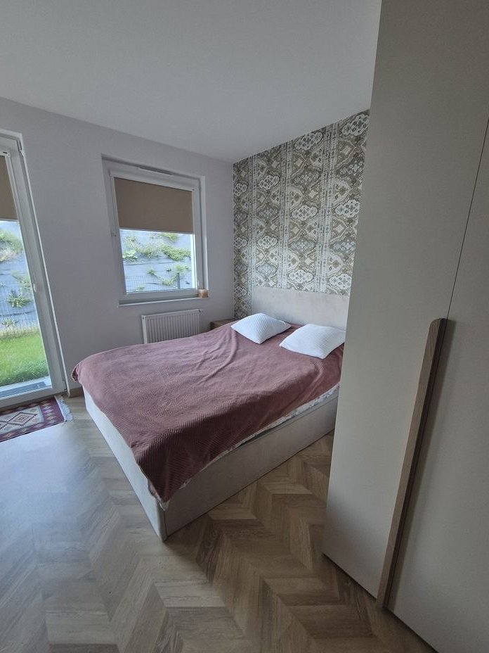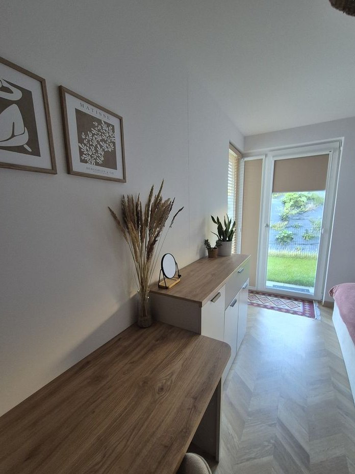 Ustawny układ – salon z aneksem kuchennym w pełni wyposażony i wyjsciem na pierwszy ogródek okolo 25m2, dwie regularne sypialnie okolo 7,8m2 każda z biurkami , szafami i łożkami oraz duża głowna sypialnia 16,8 m2 z duzymi przeszkleniami, łozkiem 160x200, biurkiem szafkami wokół oraz ogromną szafą i wyjsciem na duży drugi ogórdek 50m2, dwie niezależne łazienki , jedna z wanną, druga z prysznicem które można wykorzystywać jako schowek, pralnia lub garderoba. W korytarzu znajduje się spora szafa, zabudowa na buty .