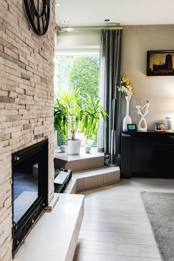 Dzięki przestronnym oknom i południowo – zachodniej ekspozycji strefa dzienna jest bardzo dobrze doświetlona. Posiada wyjście na taras z salonu i kuchni oraz kominek z płaszczem wodnym rozprowadzonym po całym domu.