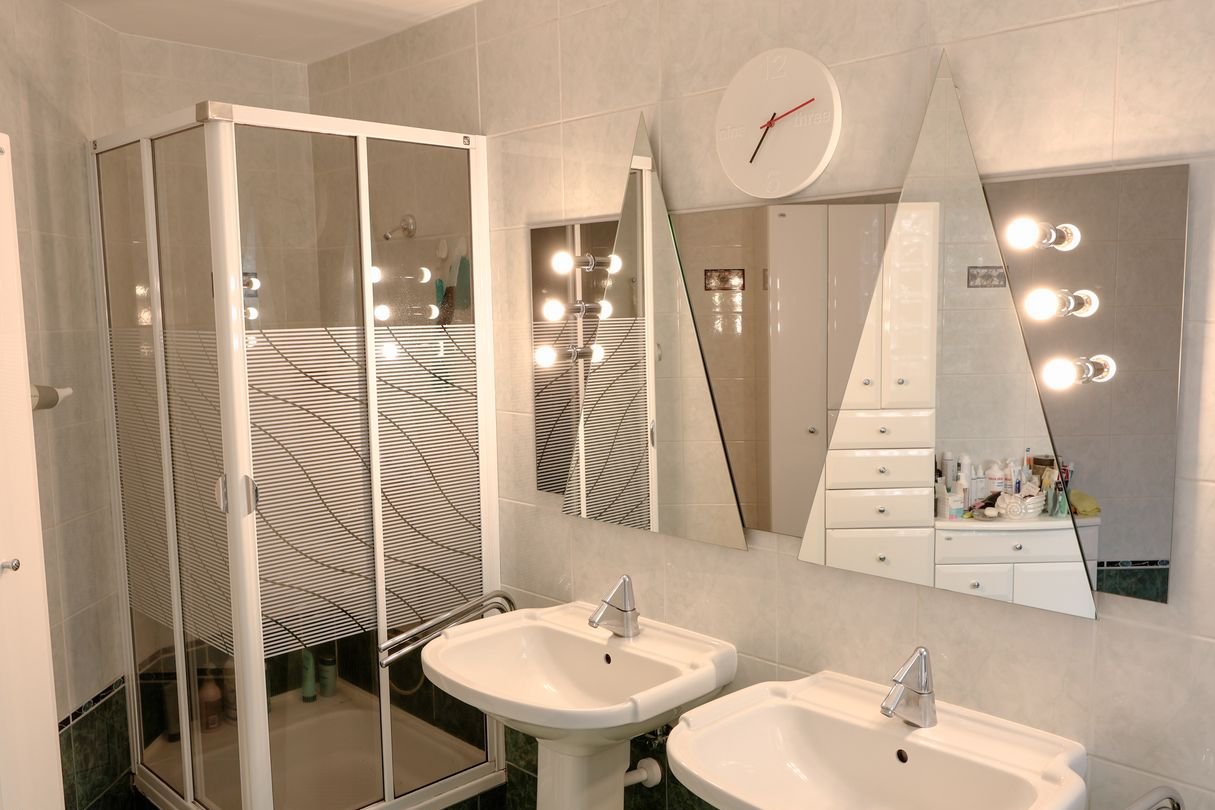 - łazienka o powierzchni około 10 m kw. z wyposażeniem: wanną i prysznicem oraz dwiema umywalkami