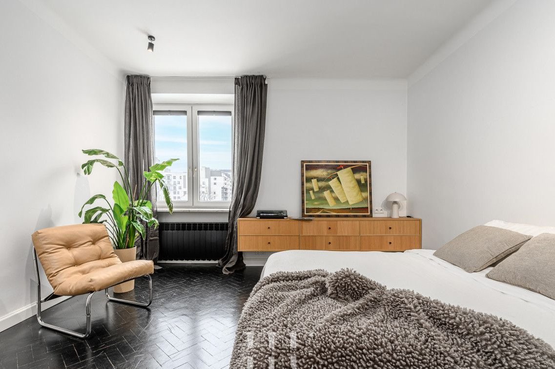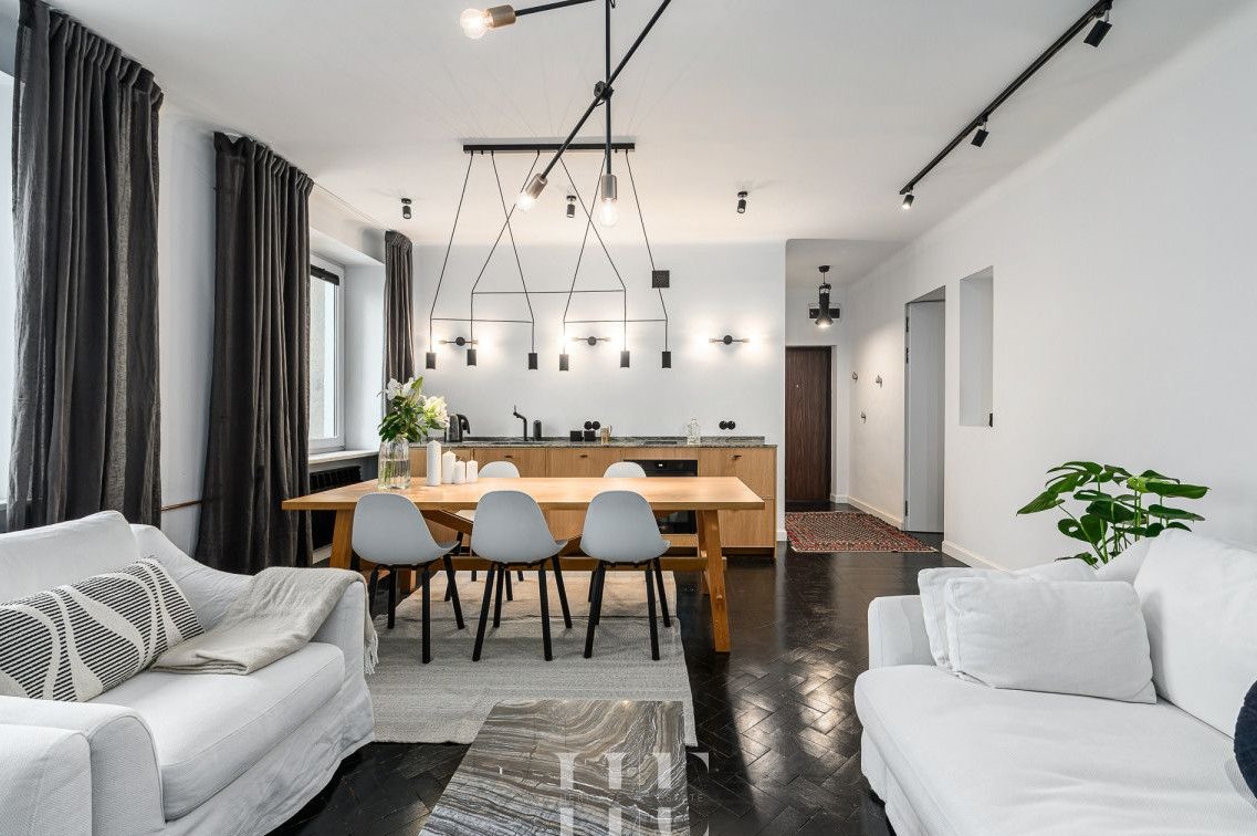 Mieszkanie po generalnym remoncie, wykończone w spójnym, nowoczesnym stylu z wyrazistym charakterem. Na podłogach dębowy parkiet pomalowany na czarno, który nadaje wnętrzu elegancji.