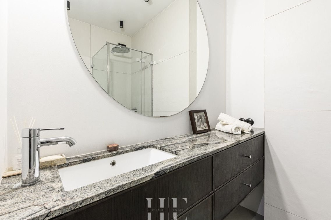 Zarówno kuchnia, jak i łazienka zostały wyposażone w kamienne blaty, które podkreślają wysoką jakość wykończenia oraz ponadczasowy charakter wnętrza.