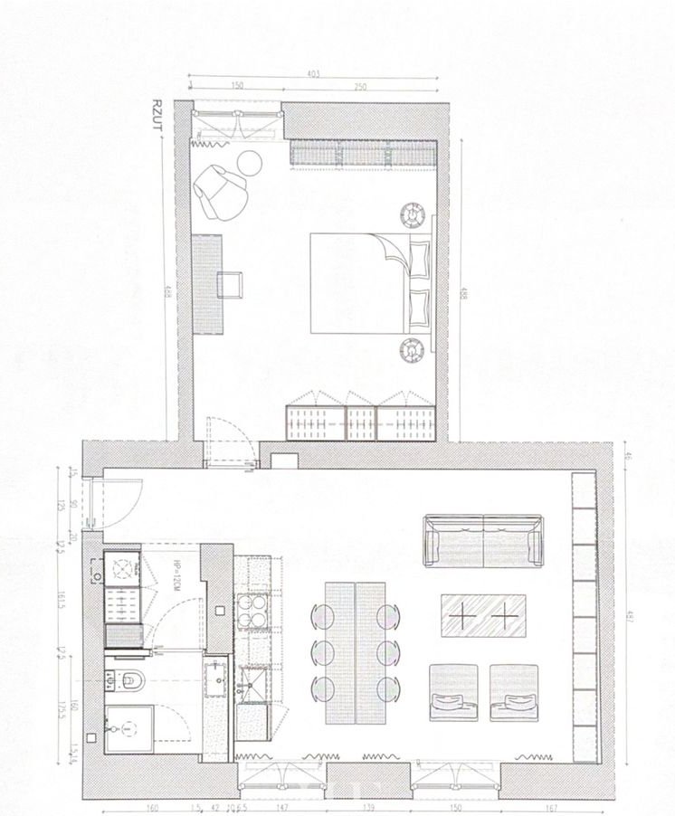 • pokój dzienny z aneksem kuchennym oraz stołem jadalnianym (z możliwością zastąpienia go wyspą kuchenną)