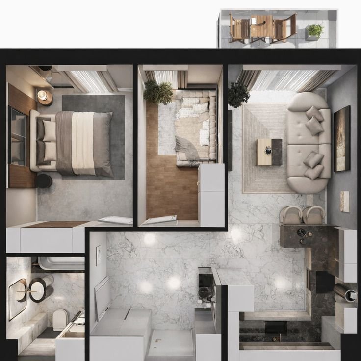 Nieruchomość składa się z salonu z aneksem oraz 2 sypialni, holu, łazienki z WC,