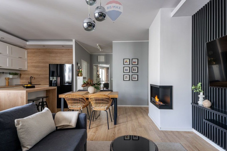 Wschodzące słońce delikatnie rozświetla salon. W kuchni parzy się kawa, a Ty wychodzisz na loggię, spoglądając na zielone patio, które jeszcze śpi. Jest cicho, spokojnie, dokładnie tak, jak lubisz. Wracasz do środka, gdzie ciepłem wita Cię przestronny salon z biokominkiem. To tutaj toczą się codzienne rozmowy, wspólne kolacje, wieczory z filmem czy weekendowe śniadania. Otwarta na salon, wykonana na wymiar kuchnia z wyspą jest elegancka, funkcjonalna i świetnie wyposażona. Niczego nie trzeba zmieniać – to miejsce tworzy kompletną całość.