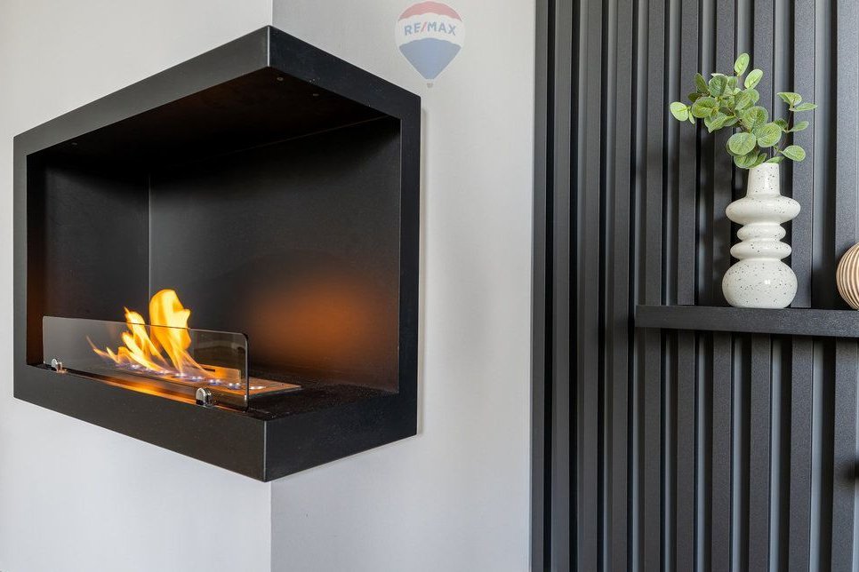 The rising sun gently brightens the living room. Coffee is brewing in the kitchen, and you step out onto the loggia, looking over the green patio that is still asleep. It’s quiet and peaceful – exactly how you like it. You return inside, where a spacious living room with a bio-fireplace welcomes you with warmth. This is where daily conversations unfold, shared dinners take place, movie nights happen, and weekend breakfasts linger. Open to the living room, the custom-built kitchen with an island is elegant, functional, and fully equipped. Nothing needs to be changed – the space forms a cohesive and complete whole.