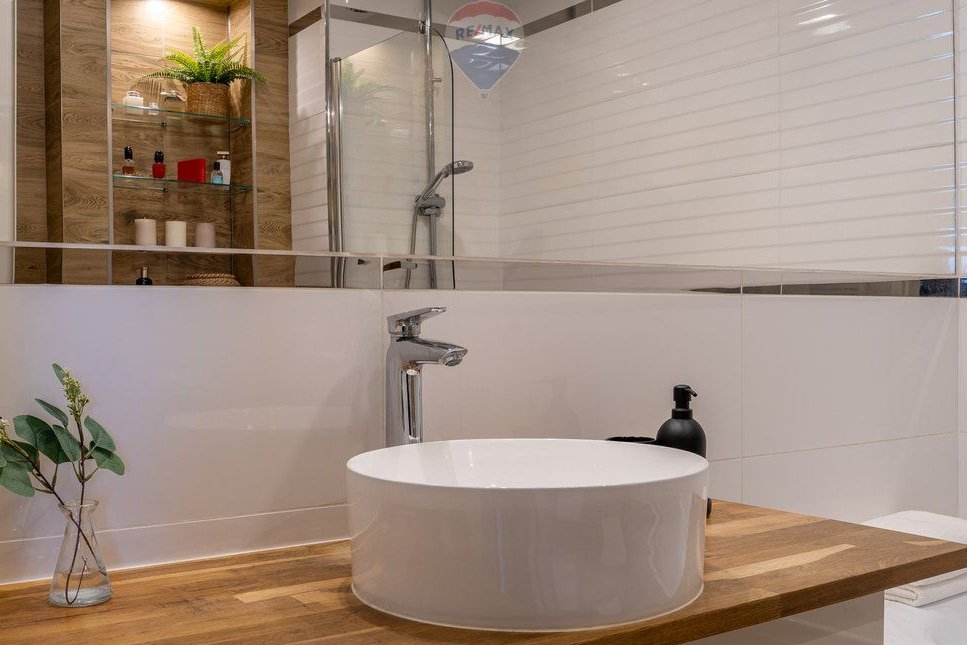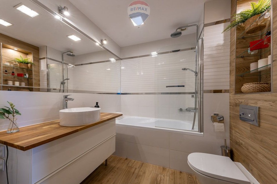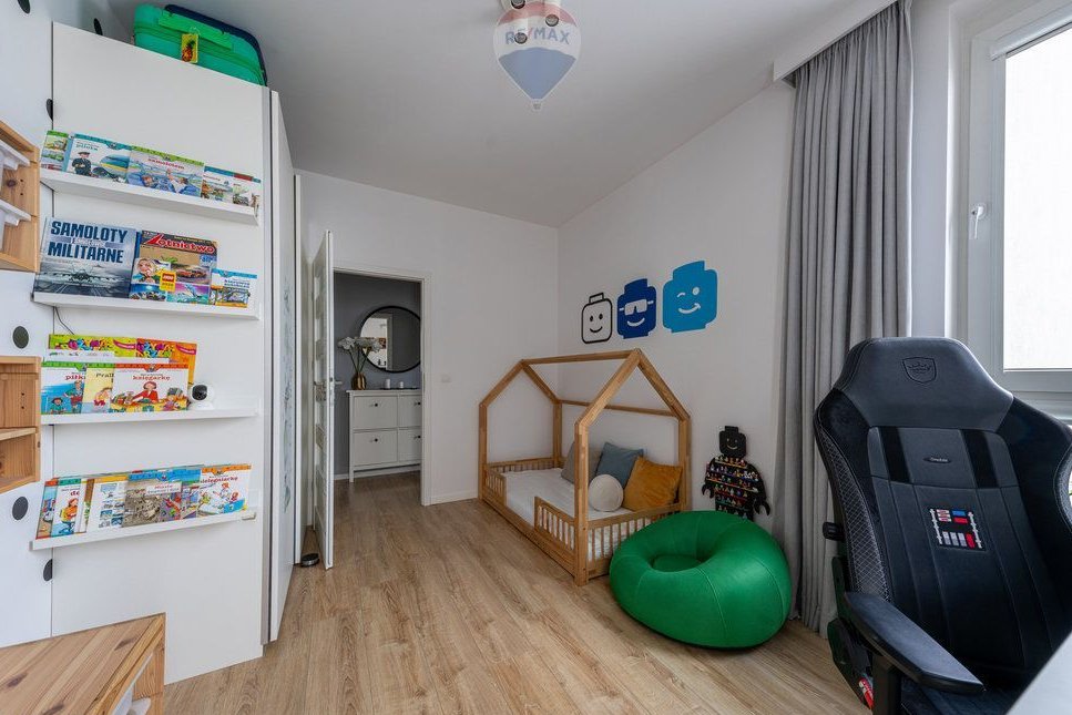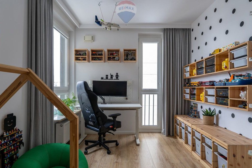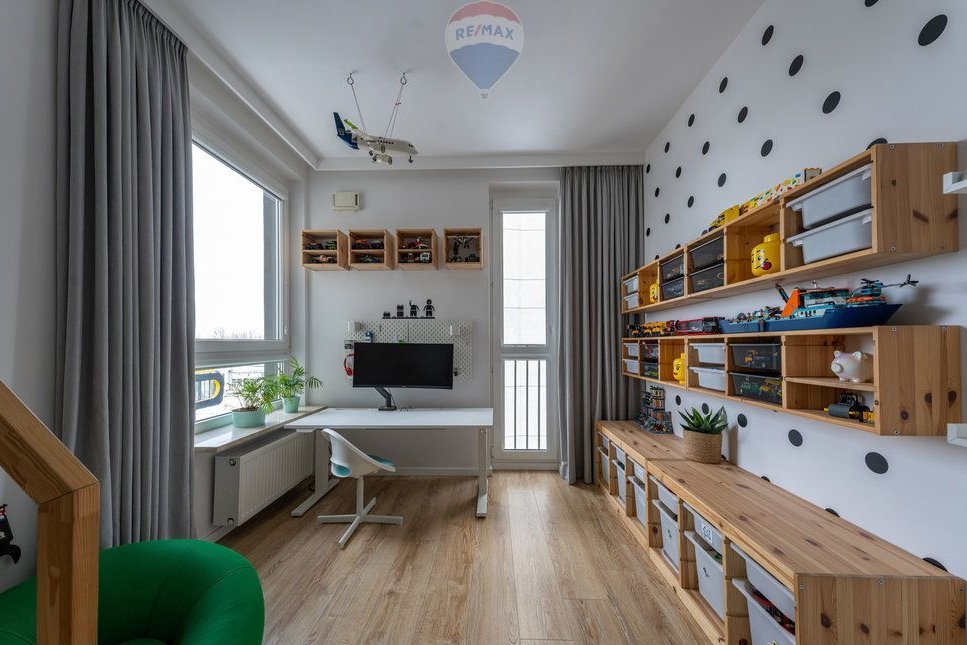 In the bedroom and on the second balcony adjoining it, you can admire stunning sunsets. The children’s room/home office tells yet another story. It’s a space for studying, remote work (featuring a height-adjustable desk), and relaxation. The bathroom, with a bathtub and rainfall shower, can transform an ordinary evening into a home SPA experience. The walk-in wardrobe, which also serves as a laundry room, helps keep daily life organized and offers the possibility of creating a second bathroom in the future – ready for new needs and plans.