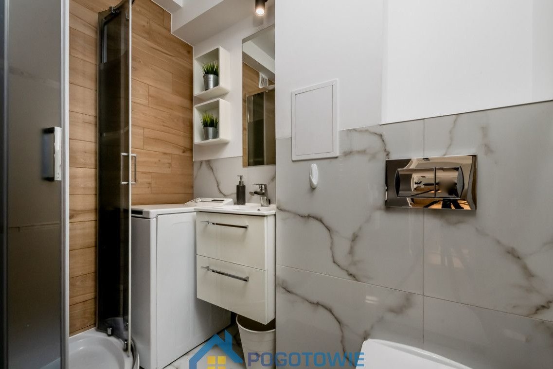Łazienka: Nowoczesna i ergonomiczna, wyposażona w kabinę prysznicową, WC, umywalkę oraz pralkę.
