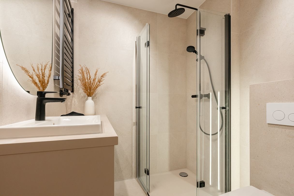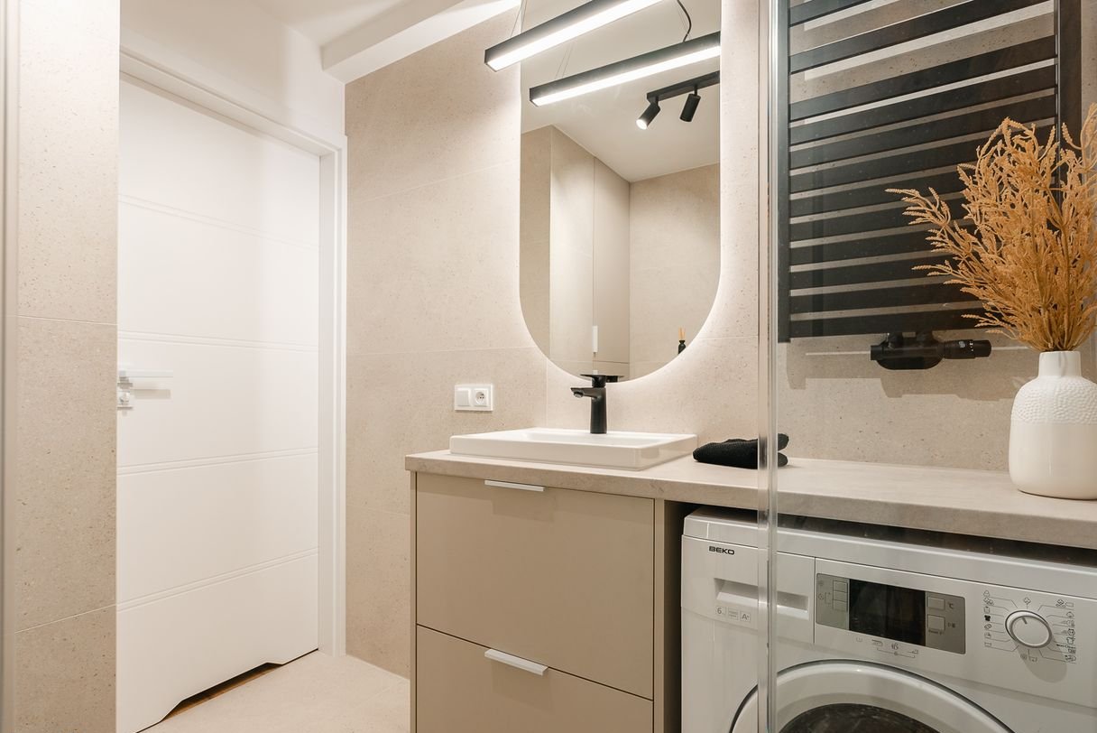 nowoczesna łazienka z prysznicem i pralką