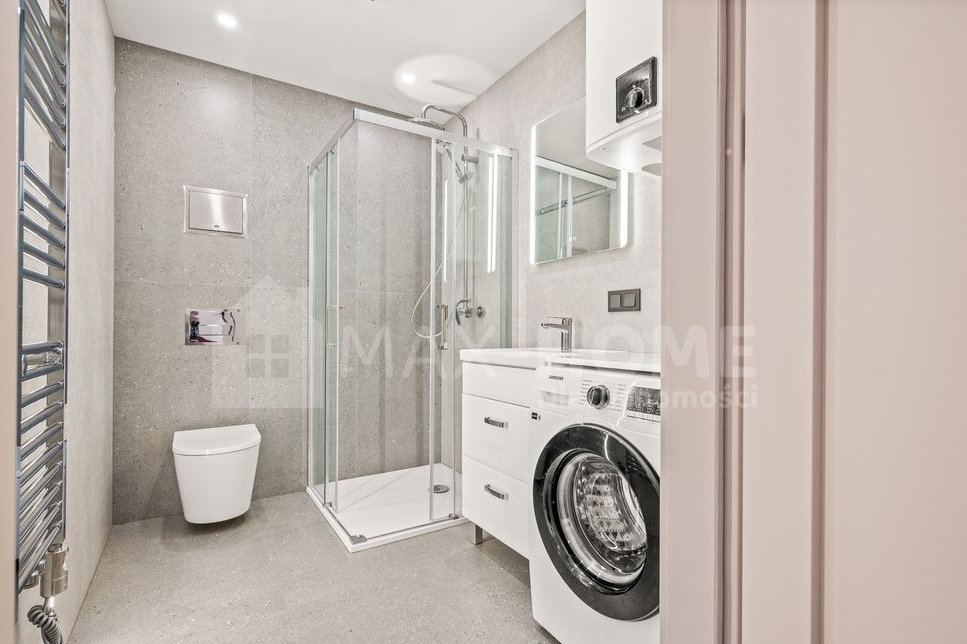 Łazienka: kabina prysznicowa, nowoczesna szafka z umywalką, toaleta oraz pralka.
