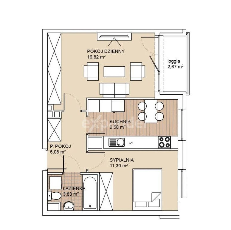 Salon o powierzchni 18,82mkw z wyjściem na loggią o powierzchni 2,67mkw