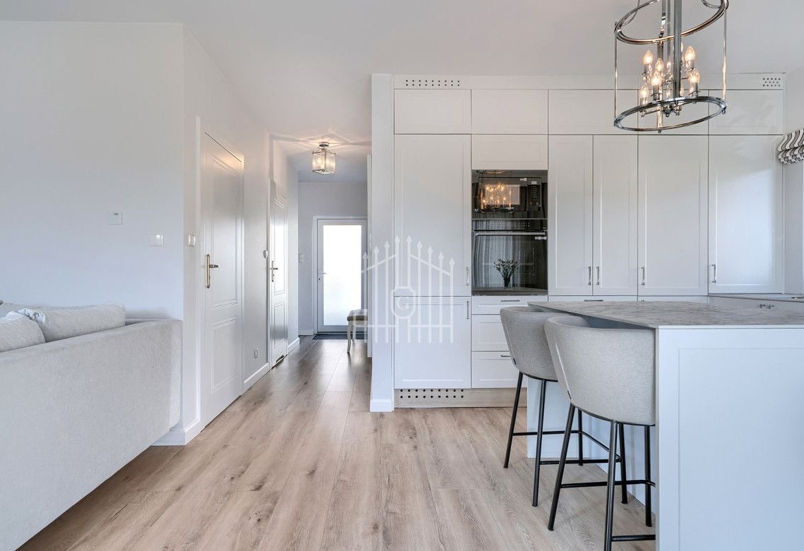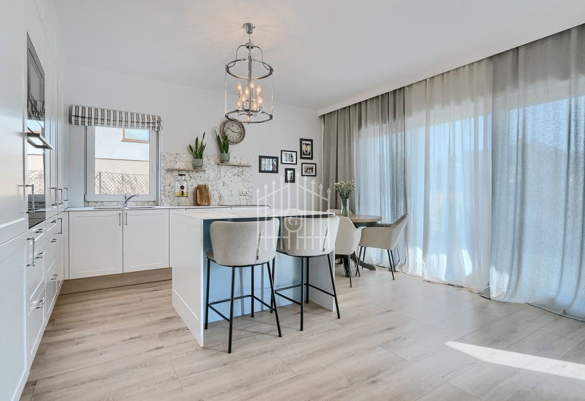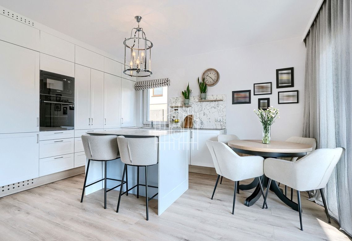 Salon z aneksem kuchennym to serce nieruchomości - jasna, otwarta przestrzeń sprzyjająca codziennym spotkaniom. Centralnym punktem jest duża wyspa, która w naturalny sposób łączy część kuchenną z dzienną, oferując dodatkowe miejsce do przechowywania i wygodną strefę roboczą. Kuchnia została wykonana na wymiar przez stolarza i wyposażona w sprzęty AGD marek Samsung i Electrolux, a dzięki północnej ekspozycji pozostaje przyjemnie chłodna. W części jadalnianej znajduje się stół z czterema krzesłami, a w strefie wypoczynkowej - wygodny narożnik, kominek na biopaliwo i telewizor, które tworzą przytulną atmosferę. Z salonu o wschodniej ekspozycji prowadzi wyjście na ogród z tarasem wykończonym deską kompozytową - idealnego miejsca na relaks i spotkania w gronie rodziny i przyjaciół.