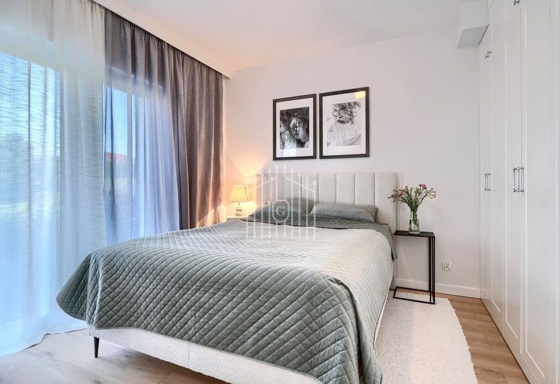 Sypialnia to wygodna przestrzeń z dużym łóżkiem i pojemną szafą w zabudowie stolarskiej, zaprojektowana tak, by sprzyjać wypoczynkowi i zachować porządek, a dzięki zachodniej ekspozycji przyjemnie doświetlona popołudniami.