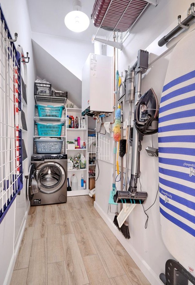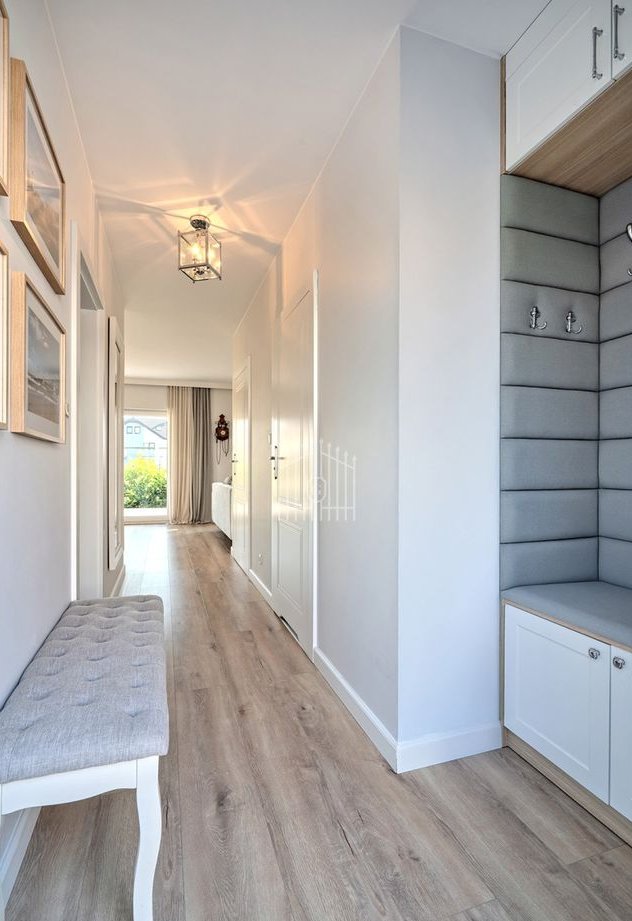 Funkcjonalny układ uzupełniają: przedpokój z praktyczną zabudową i siedziskiem oraz pomieszczenie gospodarcze, doskonałe do przechowywania rzeczy codziennego użytku.