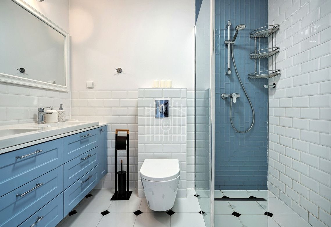 Łazienka urządzona została w nowoczesnym stylu, z elegancką kabiną prysznicową, umywalką w zabudowie i armaturą marki Grohe, co podkreśla wysoki standard wykończenia.