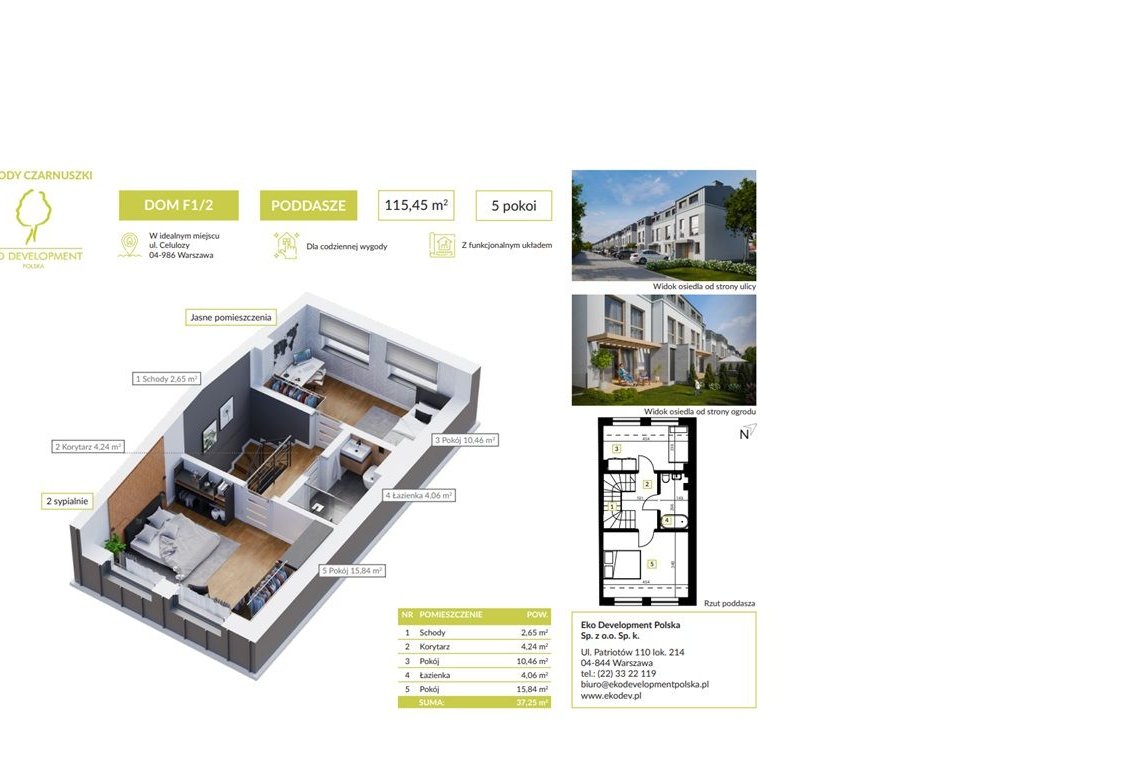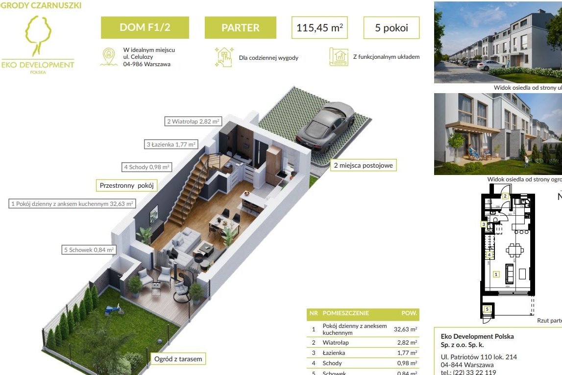 Inwestycja obejmuje 32 bezczynszowe segmenty usytuowane w 16 nowoczesnych, komfortowo zaprojektowanych budynkach w zabudowie bliźniaczej – dostępne są dwa ostatnie trzykondygnacyjne lokale o powierzchni 115m2.