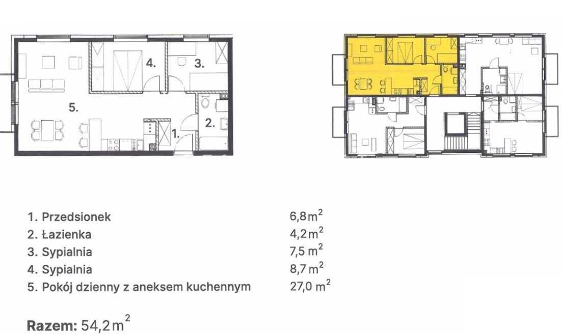 Apartament o powierzchni 54,22 m², położony na 1. piętrze, oferuje doskonale zaplanowaną przestrzeń, która spełni oczekiwania nawet najbardziej wymagających klientów. Duże przeszklenia oraz przemyślany układ wnętrz gwarantują komfort, przestrzeń i naturalne światło przez cały dzień.
