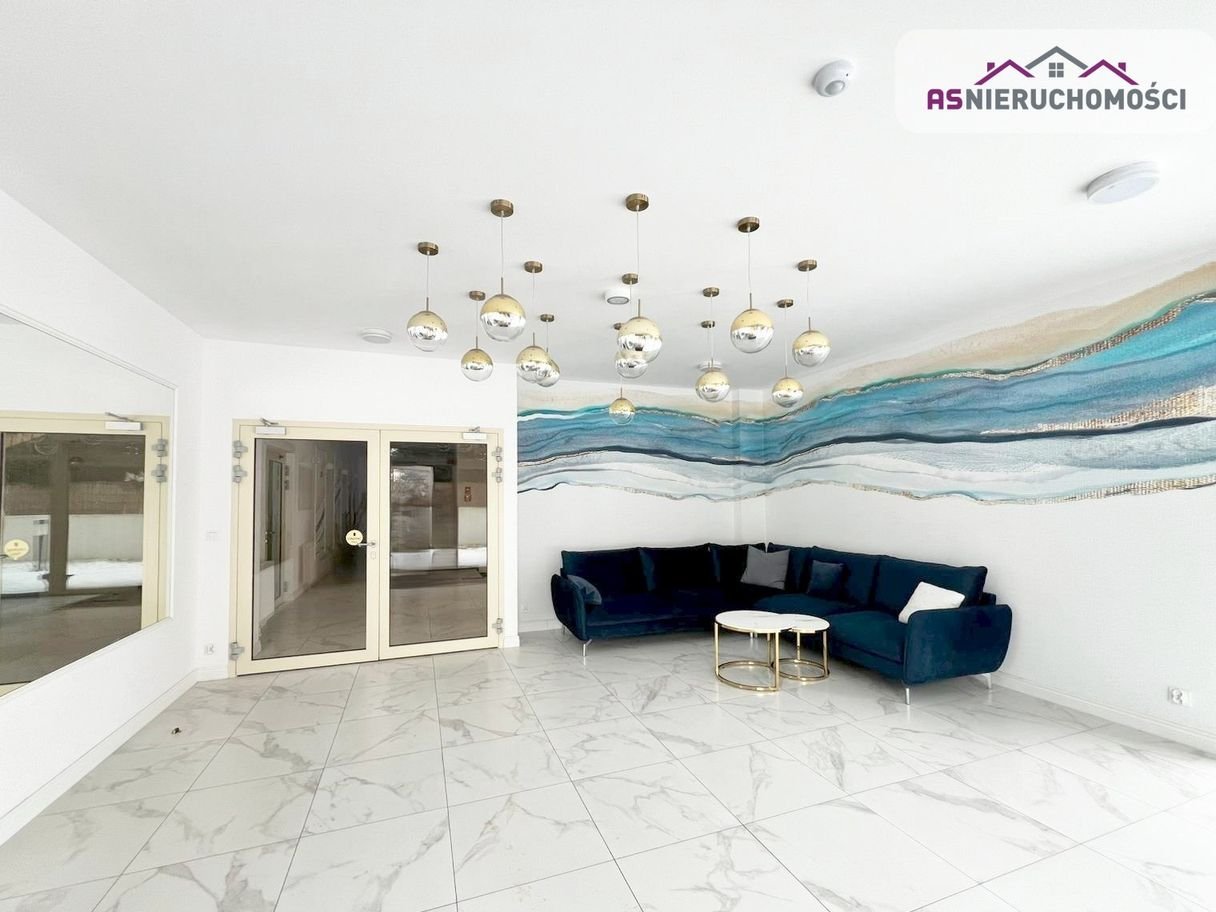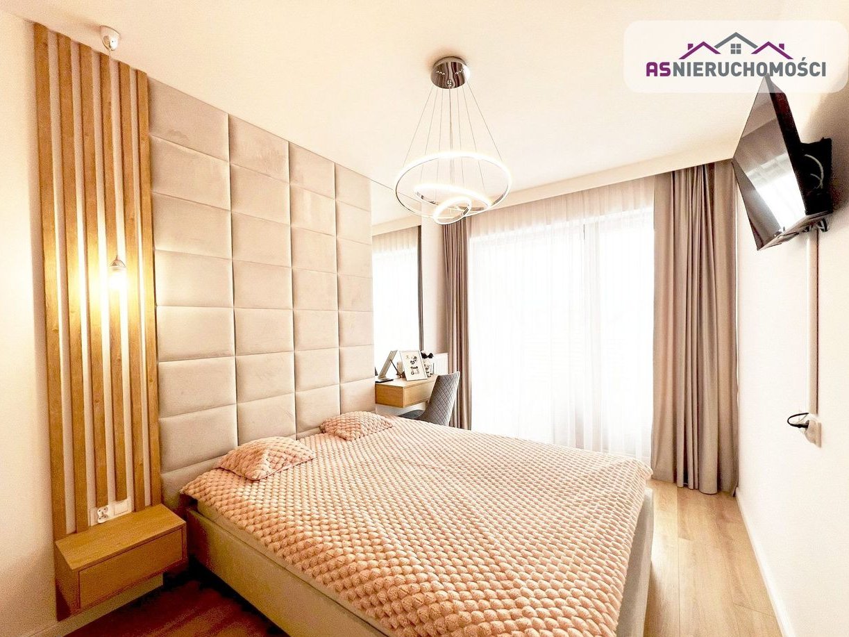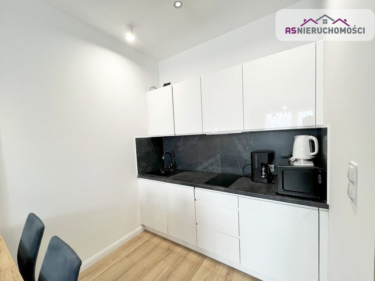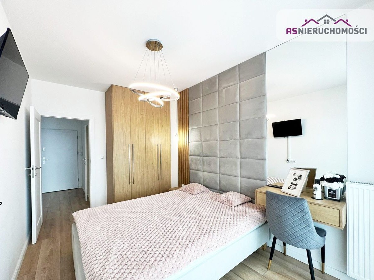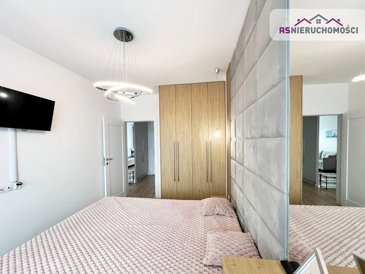 Aneks kuchenny wyposażony w nowoczesne meble w zabudowie oraz sprzęt AGD: lodówka, płyta indukcyjna i zmywarka. Salon urządzony według najnowszych trendów. Designerska sypialnia zaaranżowana z myślą o komforcie – posiada duże tapicerowane łóżko, pojemną szafę oraz telewizor. Łazienka wykończona w wysokim standardzie, z prysznicem, pralką i nowoczesną armaturą. Duże okna świetnie doświetlają przestrzeń. Stylowe, nowoczesne oświetlenie.