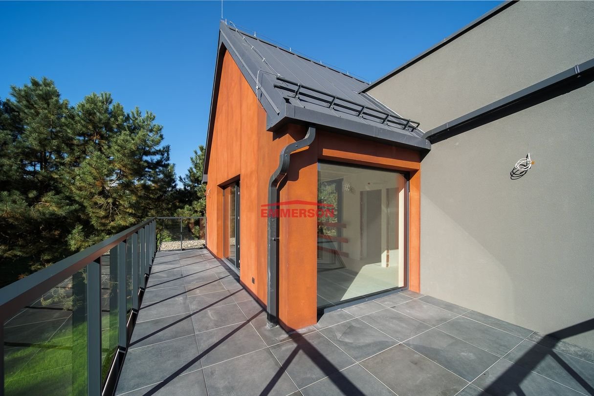 nowoczesna bryła, duże przeszklenia - stolarka aluminiowa; funkcjonalny rozkład; rozwiązania proekologiczne (pompa ciepła, rekuperacja, zbiornik wody na deszczówkę), które również wpływają na niskie koszty utrzymania; rozprowadzona instalacje pod klimatyzację (salon oraz główna sypialnia);wykonany ruraż pod instalację fotowoltaiki; brama wjazdowa na pilota; ogrodzenie z betony architektonicznego + panel; działka zagospodarowana, z nasadzeniem; światłowód