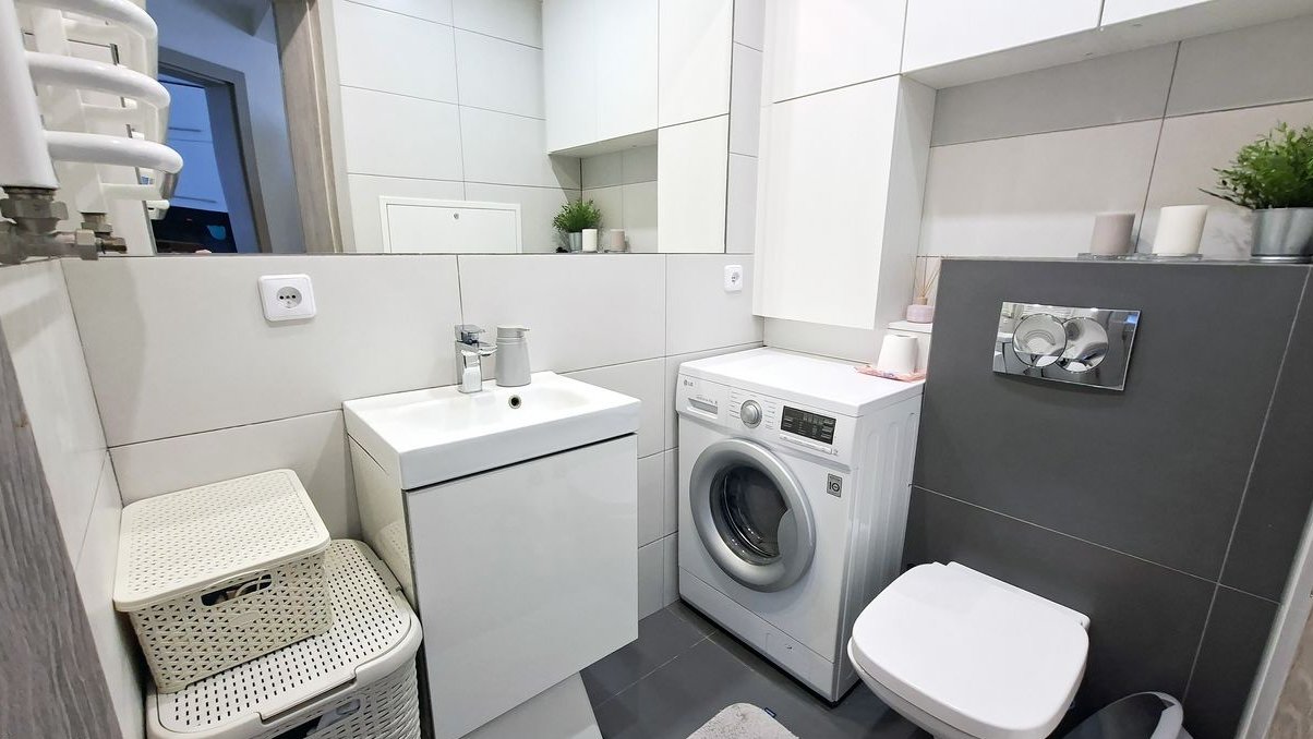 Łazienka: szafki, umywalka, pralka, WC