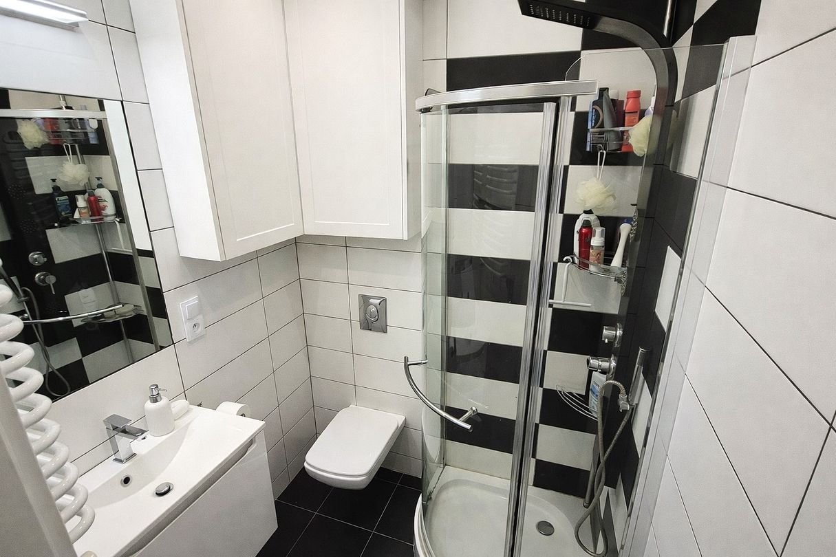 Łazienka: umywalka, szafki, kabina prysznicowa, WC