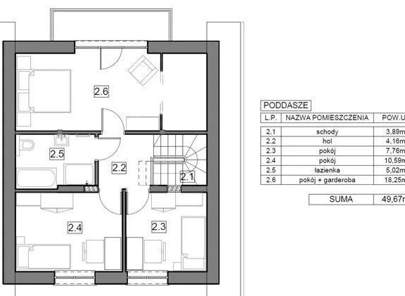• pokrycie: dachówka ceramiczna, okna dachowe FAKRO, rynny PCV Gamrat