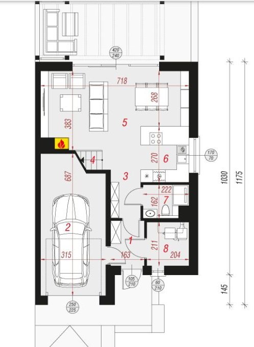 Powierzchnia użytkowa domu wynosi 107 m2: plus garaż 20,71 m2