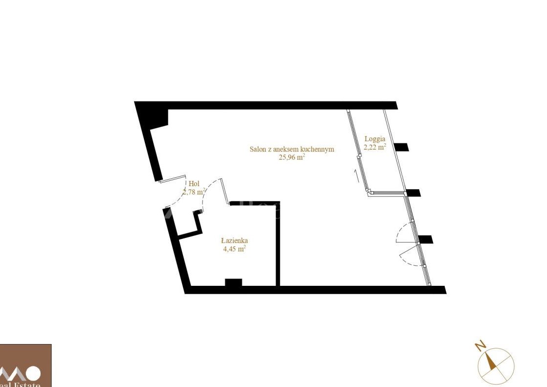 Nieruchomość znajduje się na pierwszym piętrze budynku, ma powierzchnię 33,19 m2 i składa się z pokoju dziennego z aneksem kuchennym, przedpokoju oraz łazienki z wc. Istnieje możliwość wydzielenia aneksu sypialnianego. Stan deweloperski pozwala na adaptację lokalu według własnegu gustu i potrzeb. Ponadstandardowa wysokość pomieszczeń sięga 2,80 m2.