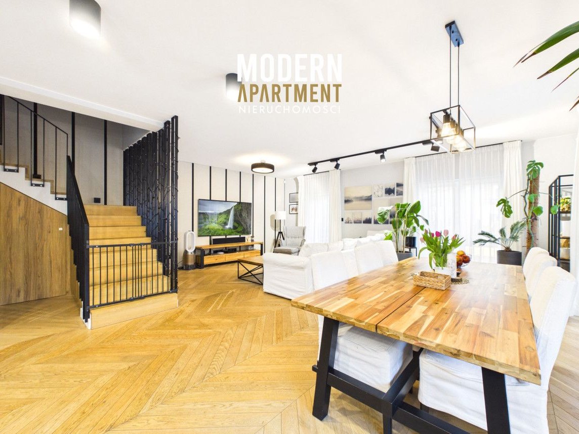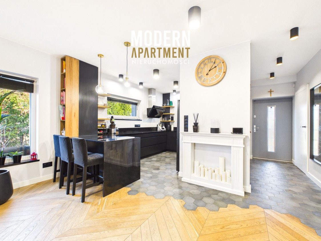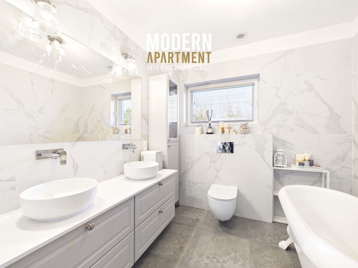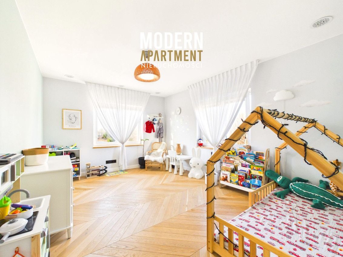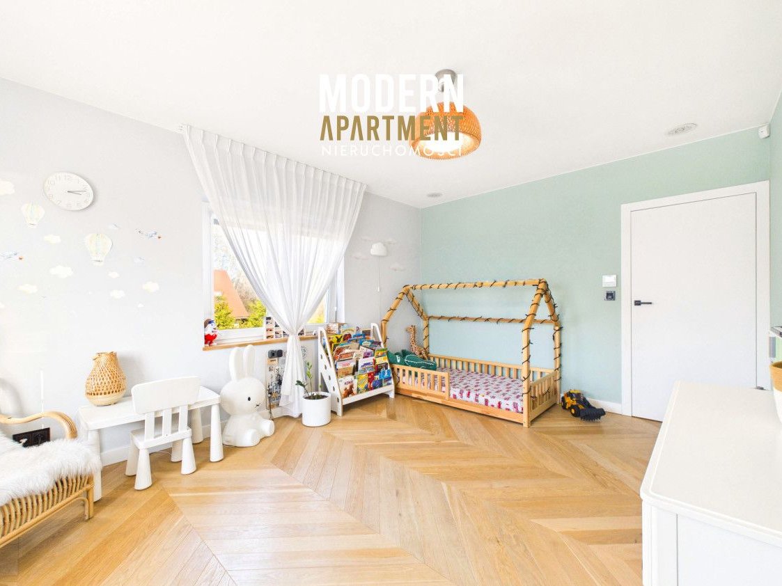 z różnorodną roślinnością dającą poczucie prywatności, wyposażony w automatyczne nawadnianie zapewniające komfort. Ponadto na terenie posesji znajduje się wiata garażowa do której prowadzi brama otwierana automatycznie. W domu zastosowano wysokiej jakości materiały wykończeniowe. Na parterze znajduje się przestronna strefa dzienna (salon z kuchnią i jadalnią) z wyjściem na zadaszony taras, łazienka z prysznicem (pełniąca również funkcję pralni) oraz pomieszczenie gospodarcze. Piętro obejmuje trzy pokoje. Dwa z nich pełnią funkcję biura i pokoju dziecięcego. Trzeci to sypialnia małżeńska z garderobą i prywatną łazienką. Na piętrze znajduje się również jasny pokój kąpielowy z wanną oraz dwiema umywalkami.Na działce przeprowadzono drenaż dla lepszego odprowadzenia wód opadowych, automatyczny system nawadniania roślin, oświetlenie ogrodu, taras z desek kompozytowych. W domu poza wentylacją mechaniczną z rekuperatora również zamontowano klimatyzację. Moskitiery w oknach. Internet dostępny poprzez światłowód. Dojazd do posesji utwardzony.