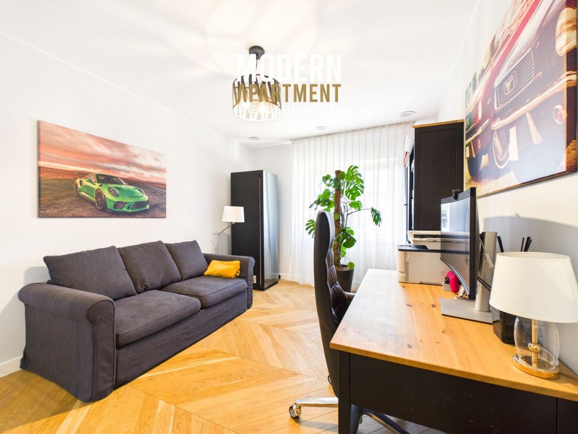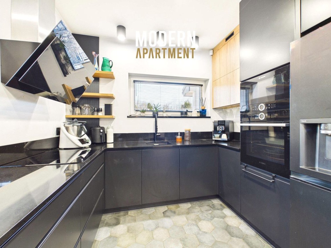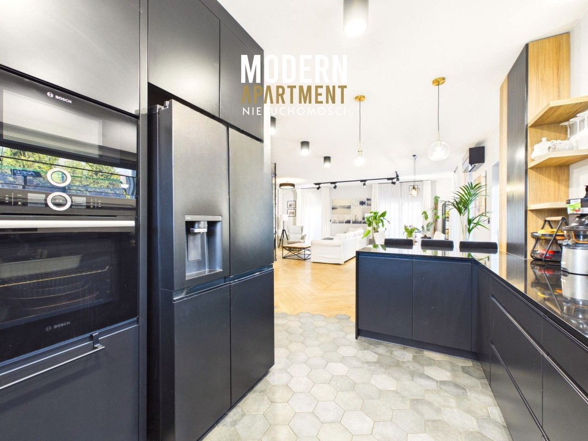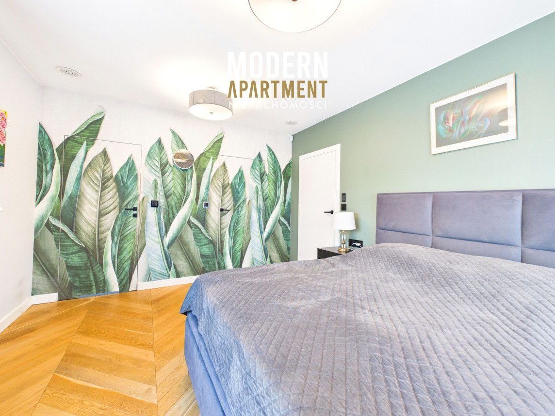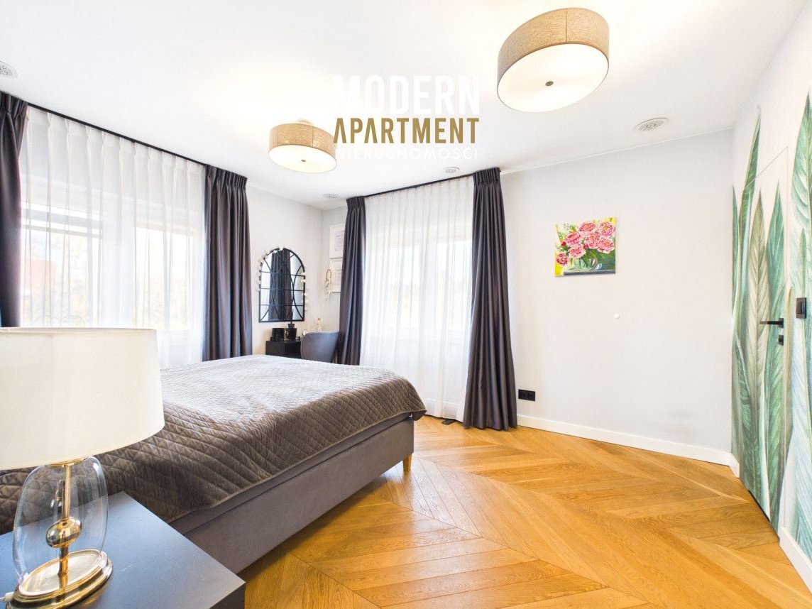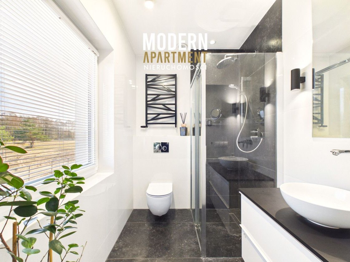 z różnorodną roślinnością dającą poczucie prywatności, wyposażony w automatyczne nawadnianie zapewniające komfort. Ponadto na terenie posesji znajduje się wiata garażowa do której prowadzi brama otwierana automatycznie. W domu zastosowano wysokiej jakości materiały wykończeniowe. Na parterze znajduje się przestronna strefa dzienna (salon z kuchnią i jadalnią) z wyjściem na zadaszony taras, łazienka z prysznicem (pełniąca również funkcję pralni) oraz pomieszczenie gospodarcze. Piętro obejmuje trzy pokoje. Dwa z nich pełnią funkcję biura i pokoju dziecięcego. Trzeci to sypialnia małżeńska z garderobą i prywatną łazienką. Na piętrze znajduje się również jasny pokój kąpielowy z wanną oraz dwiema umywalkami.Na działce przeprowadzono drenaż dla lepszego odprowadzenia wód opadowych, automatyczny system nawadniania roślin, oświetlenie ogrodu, taras z desek kompozytowych. W domu poza wentylacją mechaniczną z rekuperatora również zamontowano klimatyzację. Moskitiery w oknach. Internet dostępny poprzez światłowód. Dojazd do posesji utwardzony.