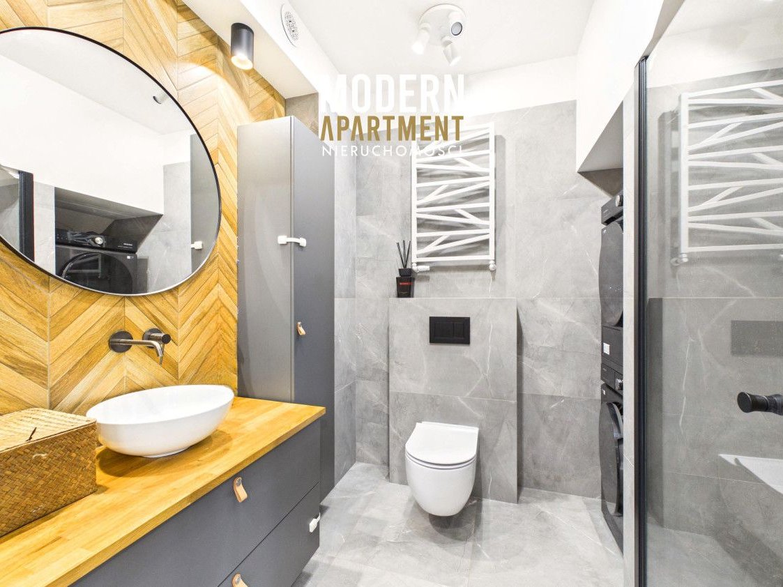 łazienka z prysznicem (w pomieszczeniu znajduje się pralka i suszarka),