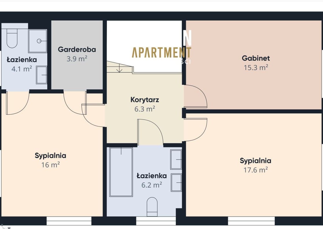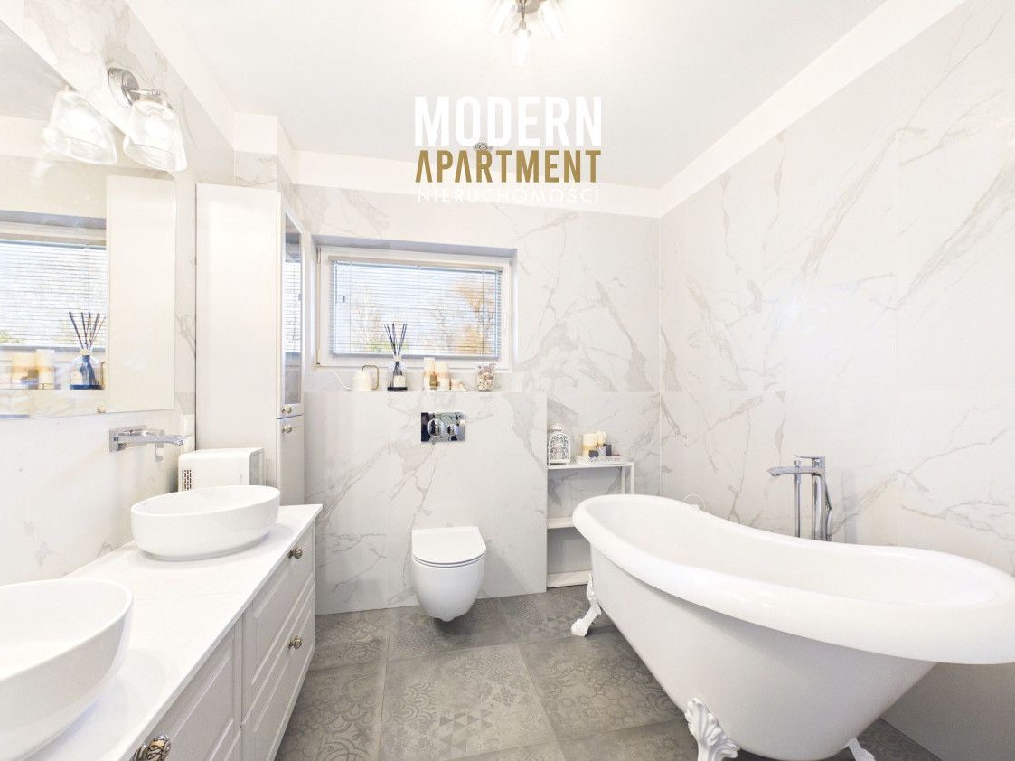 pokój kąpielowy z toaletą, wanną i dwoma umywalkami również z oknem,