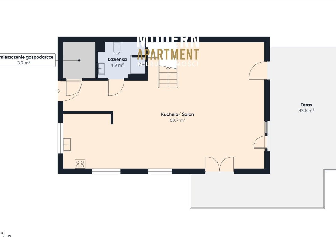 salon płynnie połączony z kuchnią oraz jadalnią z wyjściem na 43 m2 częściowo zadaszony taras.