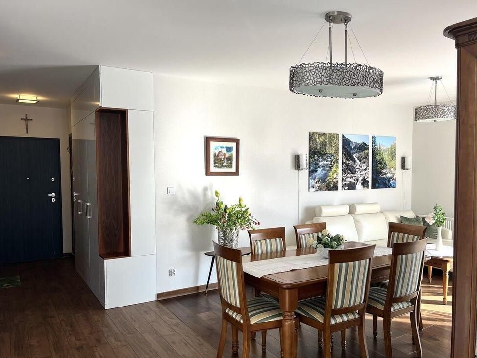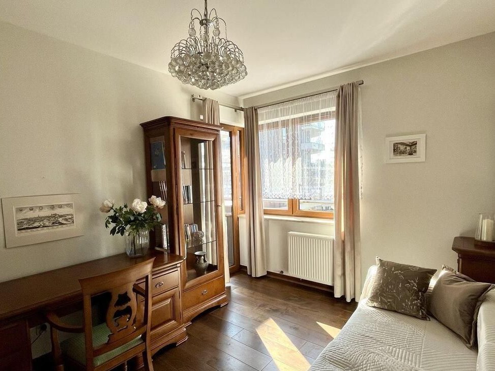 Eleganckie mieszkanie o powierzchni 72 m² na prestiżowym osiedlu Grzegórzki Park w centrum Krakowa. Wysoki standard wykończenia (pakiet Platinum), klasyczne wnętrza z meblami z litego drewna oraz dwa balkony z otwartymi widokami zapewniają wysoki komfort życia. Dojazd do Rynku Głównego zajmuje około 10 minut.